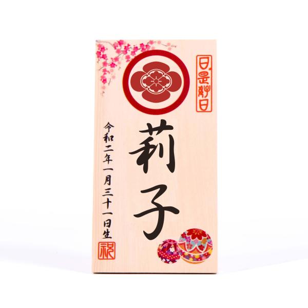 桜と鞠のデザインです。鞠には丸々と跳ね回る元気な子になれとの願いが込められています。国産 檜葉(ヒバ/あすなろ) の木板を使用しています。板へ直接、家紋・お名前・生年月日を印刷してお届け致します。生年月日の印字は和暦(平成・令和)です。