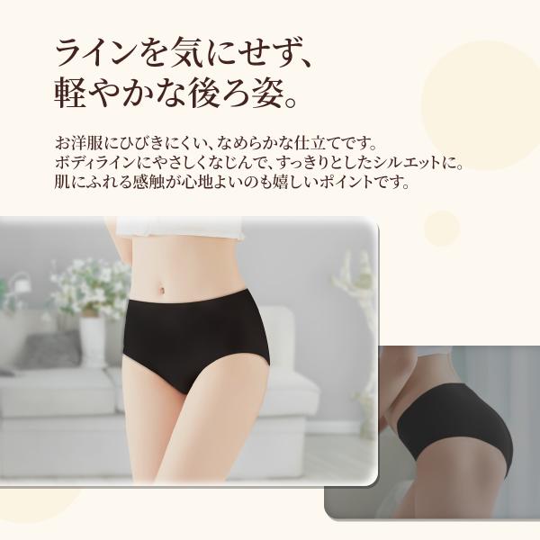 ■ ファッションを、もっと自由に。 縫い目を一切なくした「無縫製」技術により、タイトなスキニーパンツやレギンス、ボディラインの出るワンピースを着ても、下着のラインが外に響きません。食い込みによる不快な段差も解消し、自信の持てる美しいヒップラインを演出します。