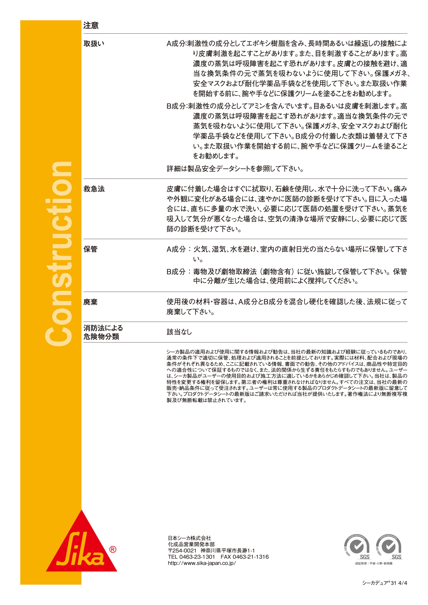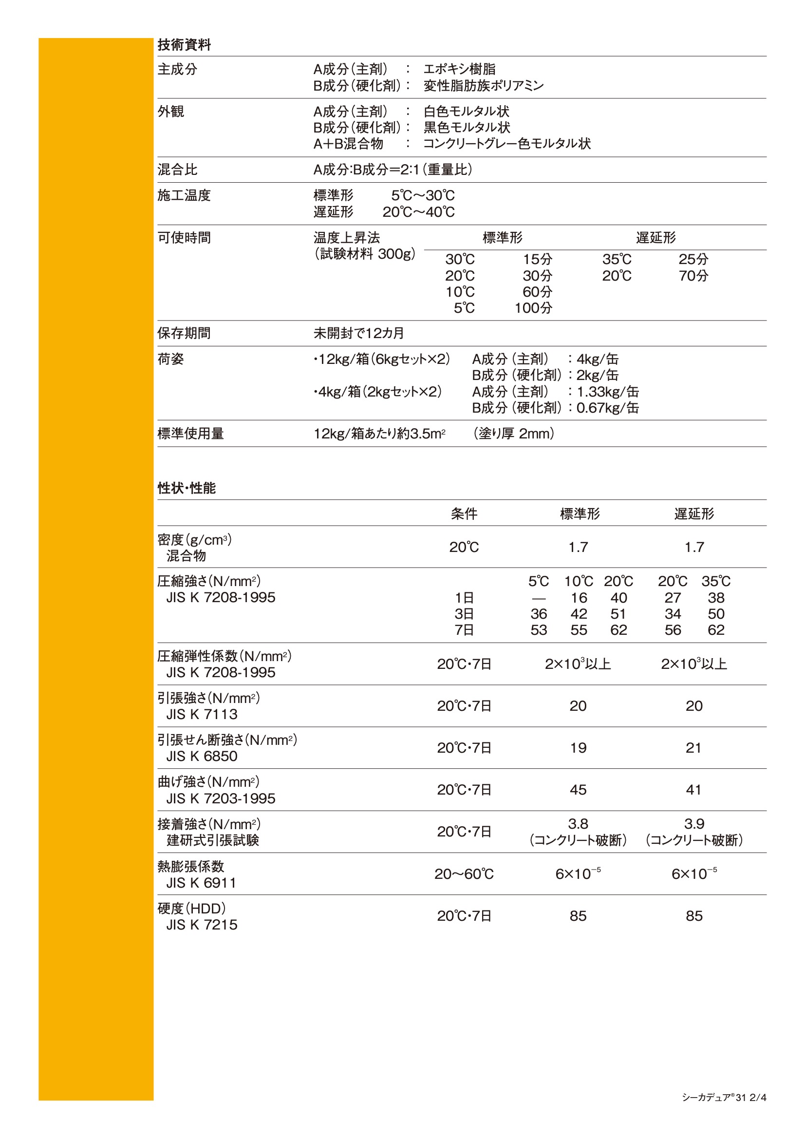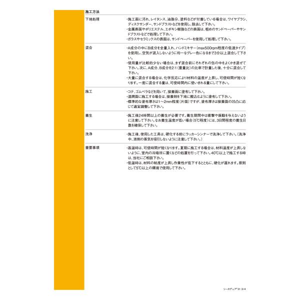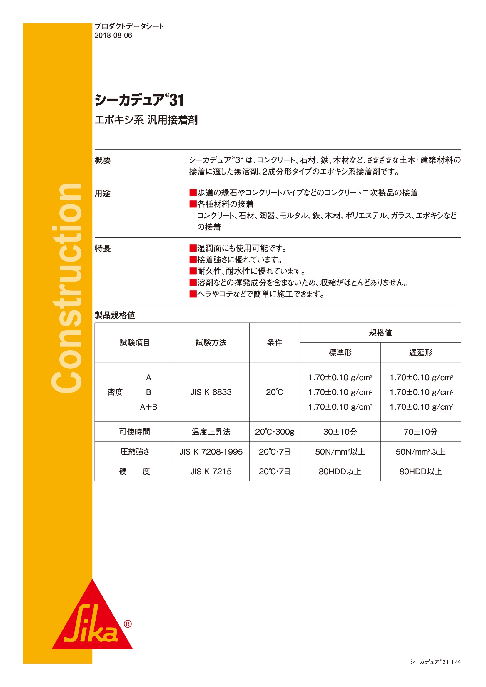 シーカデュア31は、コンクリート、石材、鉄、木材など、さまざまな土木・建築材料の接着に適した無溶剤、2成分形タイプのエポキシ系接着剤です。