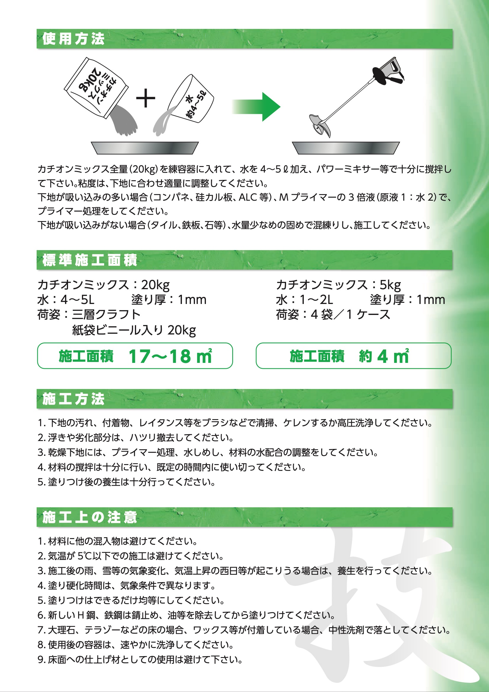 カチオンミックスは水を混入するだけの一体型なので、取扱いが容易で均一な仕上がりになります。