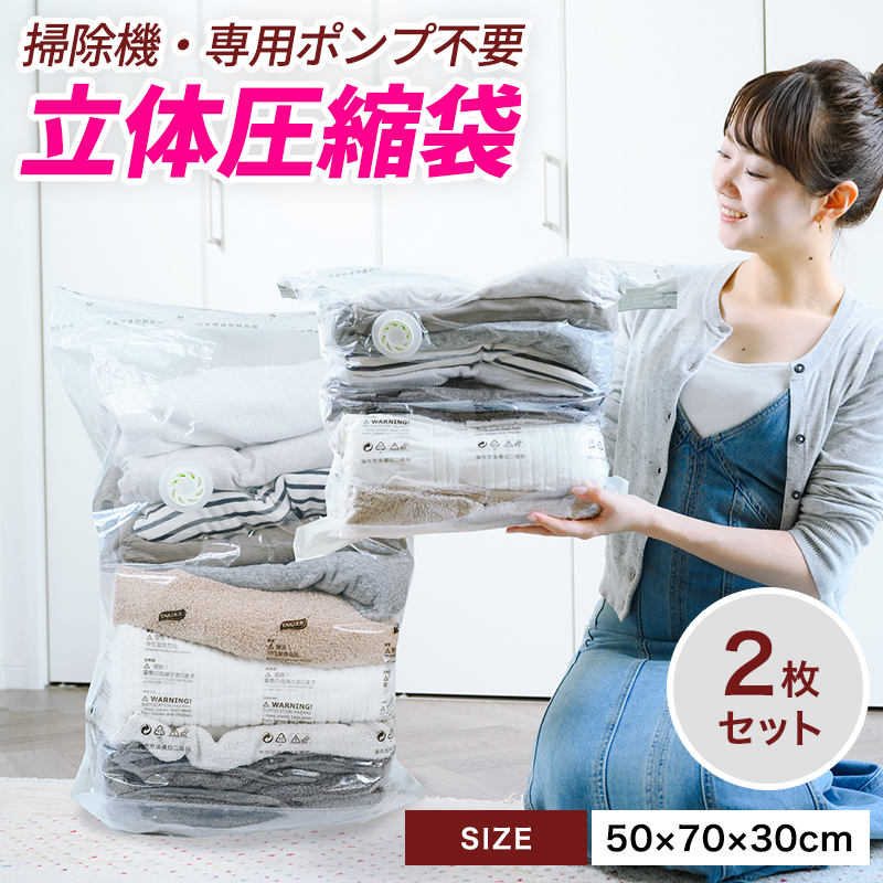 立体 圧縮袋 衣類 掃除機不要 2枚入り 押すだけ 圧縮ボックス カビ対策 新生活 立体タイプ 30cm×50cm×70cm 70×50×30 収納用品 防カビ 防虫 防湿 ふとん