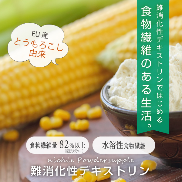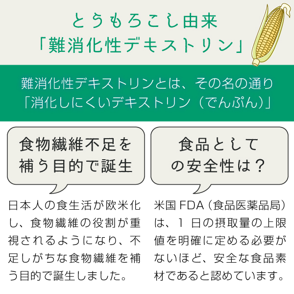 難消化性デキストリンではじめる食物繊維のある生活。水溶性食物繊維82%以上含有(固形分中)