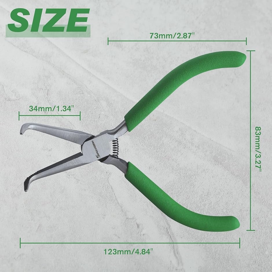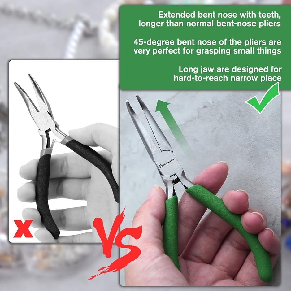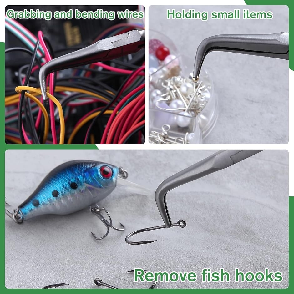 「用途」通常の先曲がりラジオペンチより長い歯付き先端部分で、ワイヤーを掴んだり曲げたり、細かいものを保持するのに最適です。
