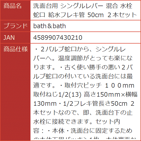 洗面台用 シングルレバー 混合 水栓 蛇口 給水フレキ管 50cm 2本セット