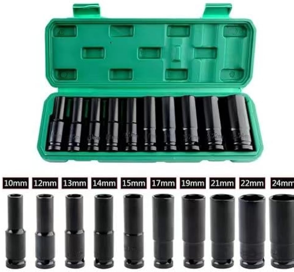 「ディープソケットのサイズ、セット内容」 10, 12, 13, 14, 15, 17, 19, 21, 22, 24 mm 自動車整備、建設現場、バイク整備、自転車整備、各種整備や修理、機械類、家具類、バッテリー交換、DIY作業など多種多様に大活躍しています。