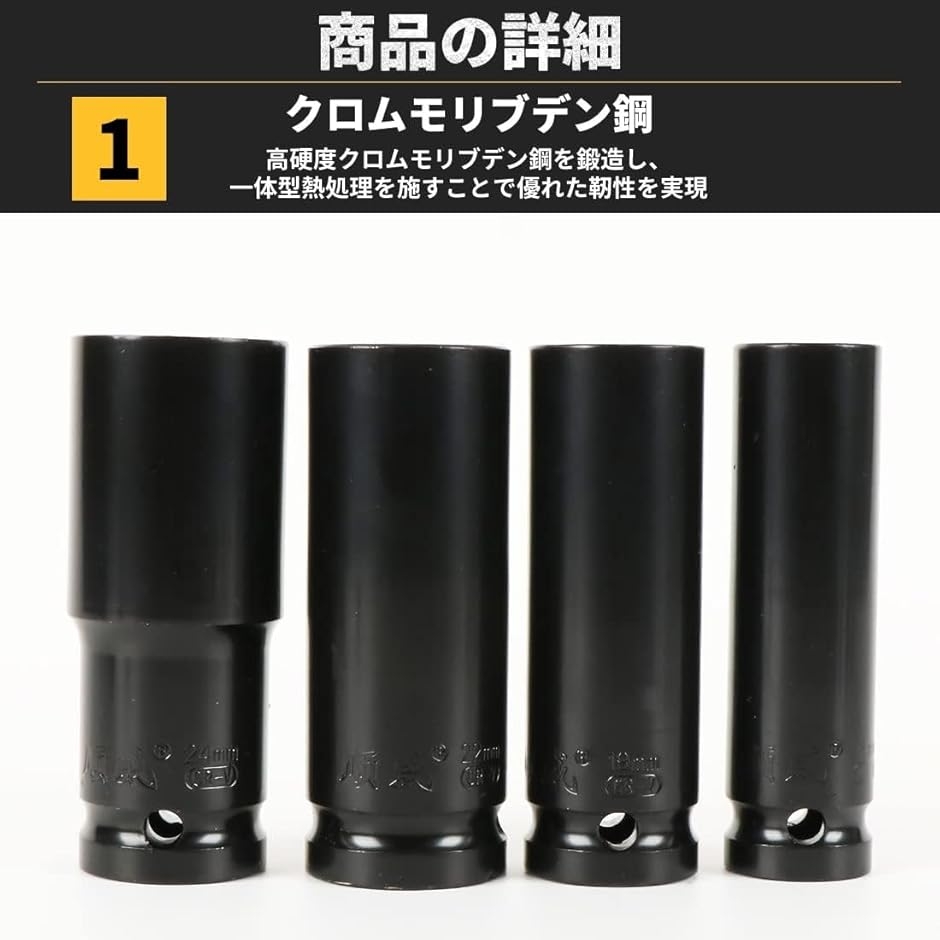 「割れにくいクロムモリブデン鋼」このディープソケットは、大きな力に耐えられるクロムモリブデン鋼を使用しております。