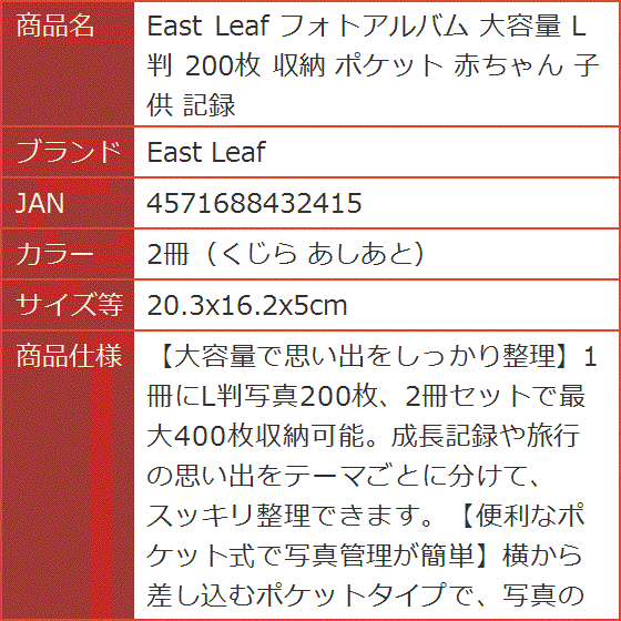 「仕様」アルバムサイズ:縦20.3cmx横16.2cmx厚さ5cm、写真サイズ:L判(8.9x12.7cm)、収納枚数:200枚、材質:紙製カバー、PP透明フィルム、個数:2冊セット