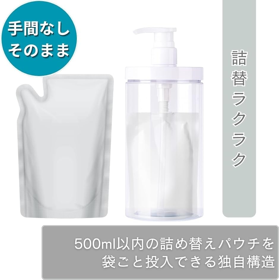 「詰替ラクラク」500 ml以内の詰め替えパウチを袋ごと投入できる独自構造。