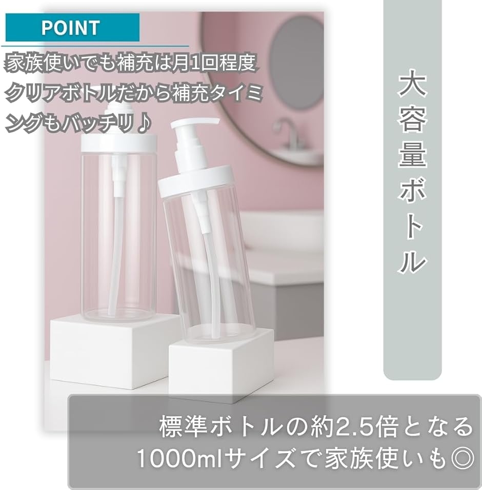 「大容量1L」標準ボトルの約2.5倍となる1000 mlサイズで、家族使いでも補充は月1回程度。