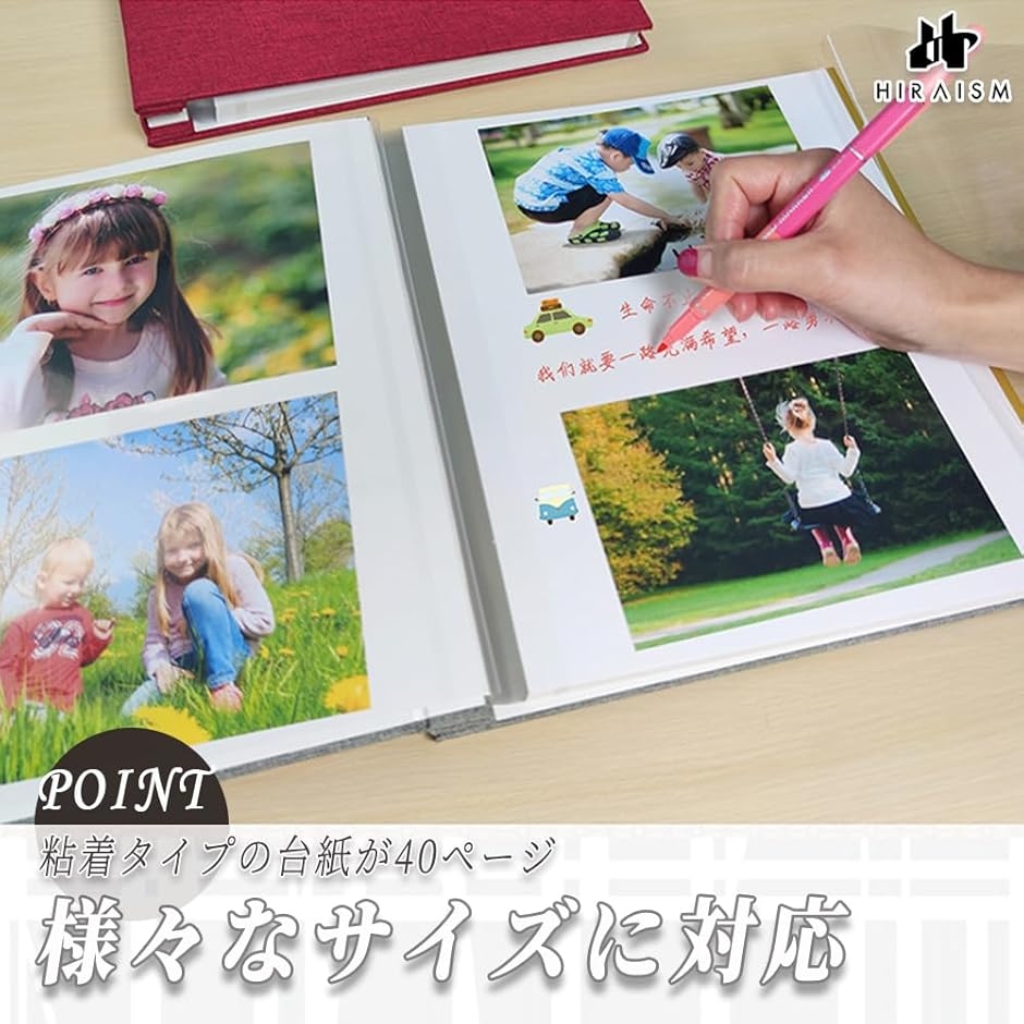 「様々なサイズに対応」 粘着タイプの台紙が40ページあり、L判、KG判はもちろん、ミニサイズや2L判、はがきなど、様々なサイズの写真に対応できます。