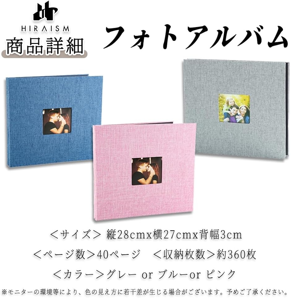 「商品内容」フォトアルバム <サイズ> 縦28cmx横27cmx背幅3cm <ページ数>40ページ <収納枚数>約360枚 <カラー>グレー or ブルーor ピンク *モニターの環境等により、色の見え方に若干差が生じる場合がございます。