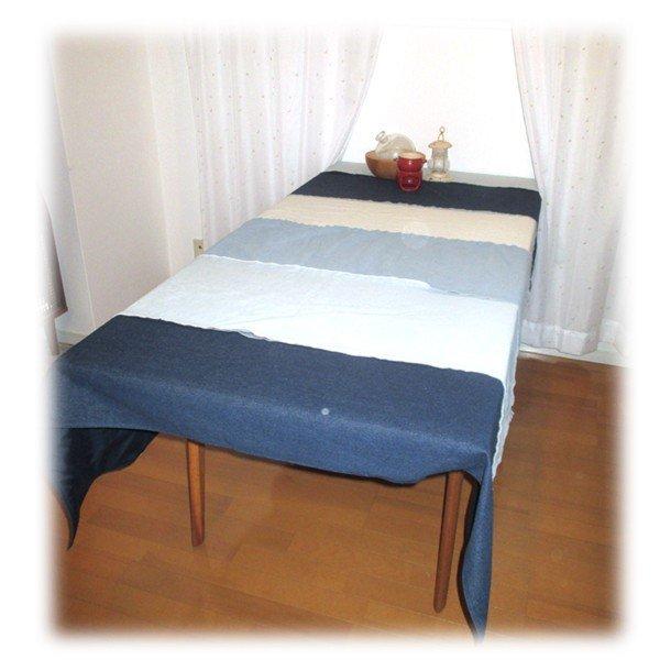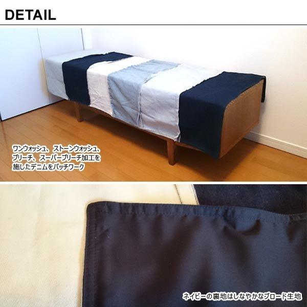 ユーズド加工を施したデニム生地をブロック状またはストライプ状に縫い合わせたデニムのマルチカバーです。