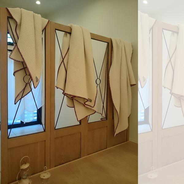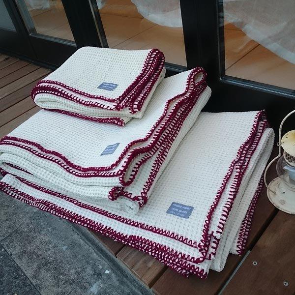 凹凸感が肌に心地いい、ワッフル織り。縫製前に洗いをかけてるのでしっかりとした凹凸感が生まれ、洗うほどにふっくらとしたボリュームとブランケット刺繍(手刺繍)でハンドメイドのような仕上がりが自慢のマルチカバー。コットン100%のやさしい肌触りで洗っても縮みません。サラッとした肌ざわりで夏はさらりと、凹凸の中に空気を抱き込み冬はほっこりオールシーズン使えるマルチカバーです。