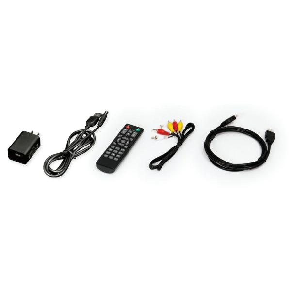■付属品:リモコン(動作確認用・単4形乾電池2本含む)、HDMIケーブル(約1.4m)、AVケーブル(約1.5m)、ACアダプタ、取扱説明書(保証書)