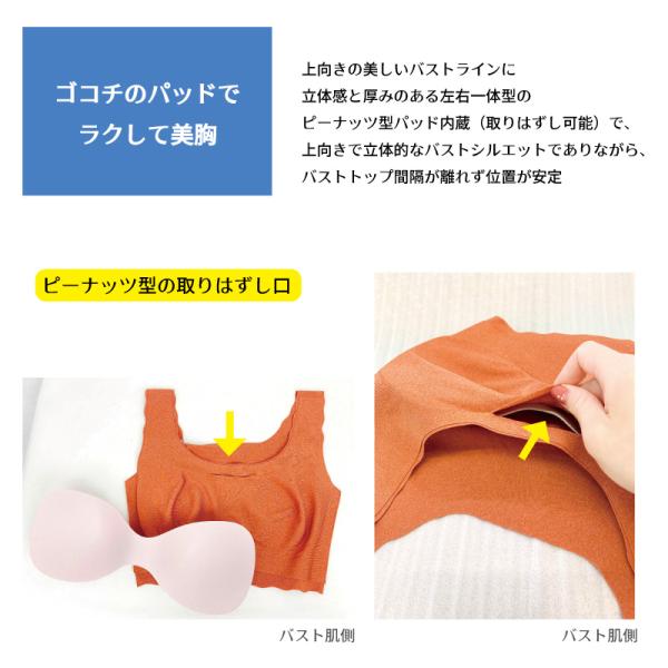 ・ピーナッツ型パッド内蔵(取りはずし可能)で、上向きで立体的なバストシルエットでありながら、バストトップ間隔が離れず位置が安定
