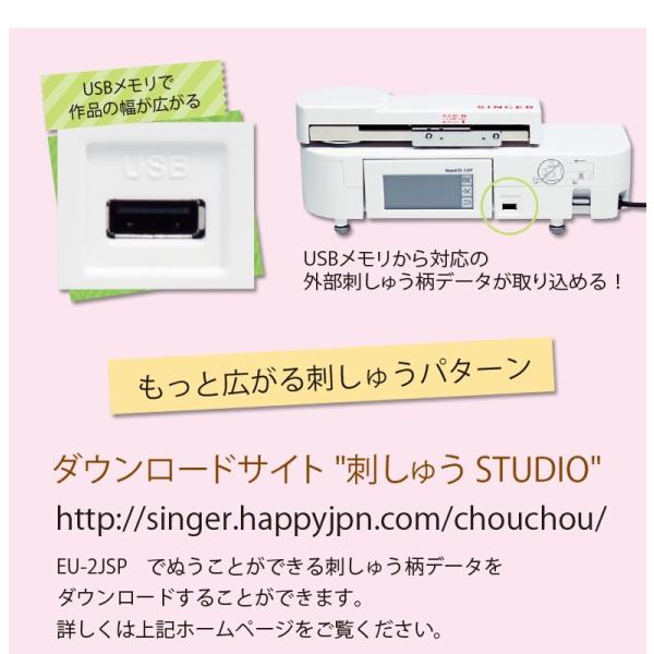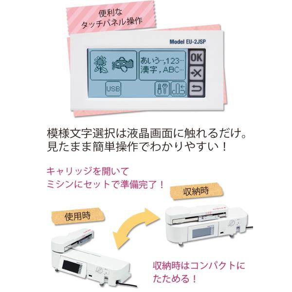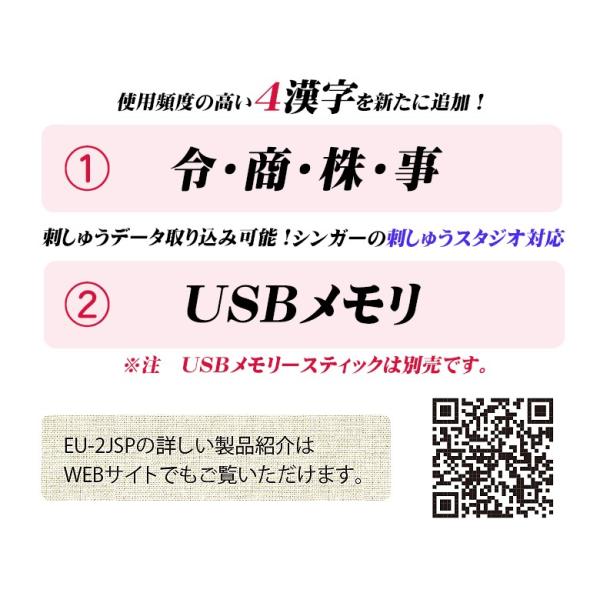※USBメモリから外部刺しゅう柄データを取り込み可能。ポイント使用頻度の高い漢字4文字が追加されたモデル。