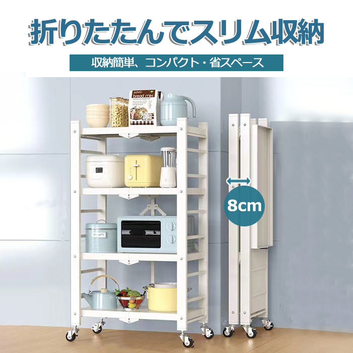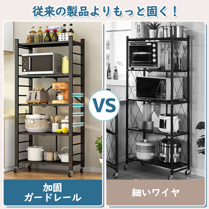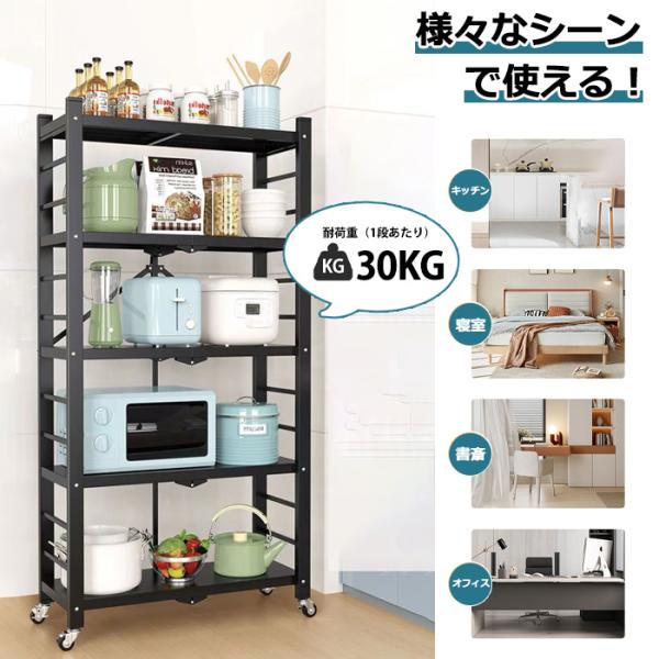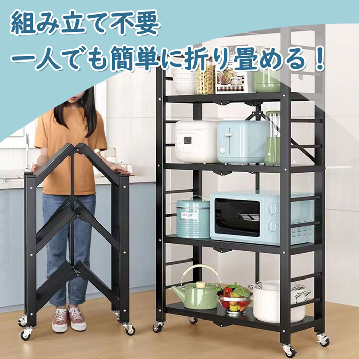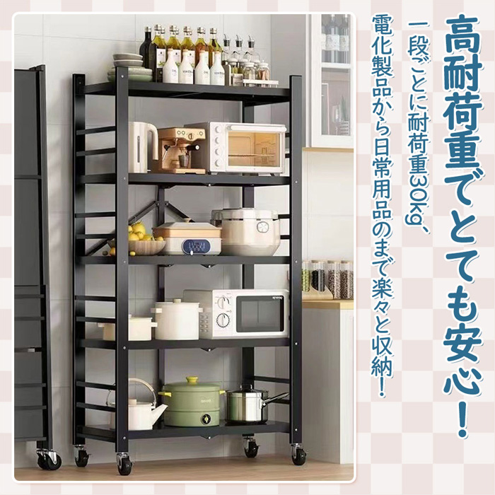 スチールラックラック 5段 折りたたみ キャスター付き 幅71 おしゃれ 幅34 黒 白 キッチンラック レンジ 組み立て簡単 高耐荷重