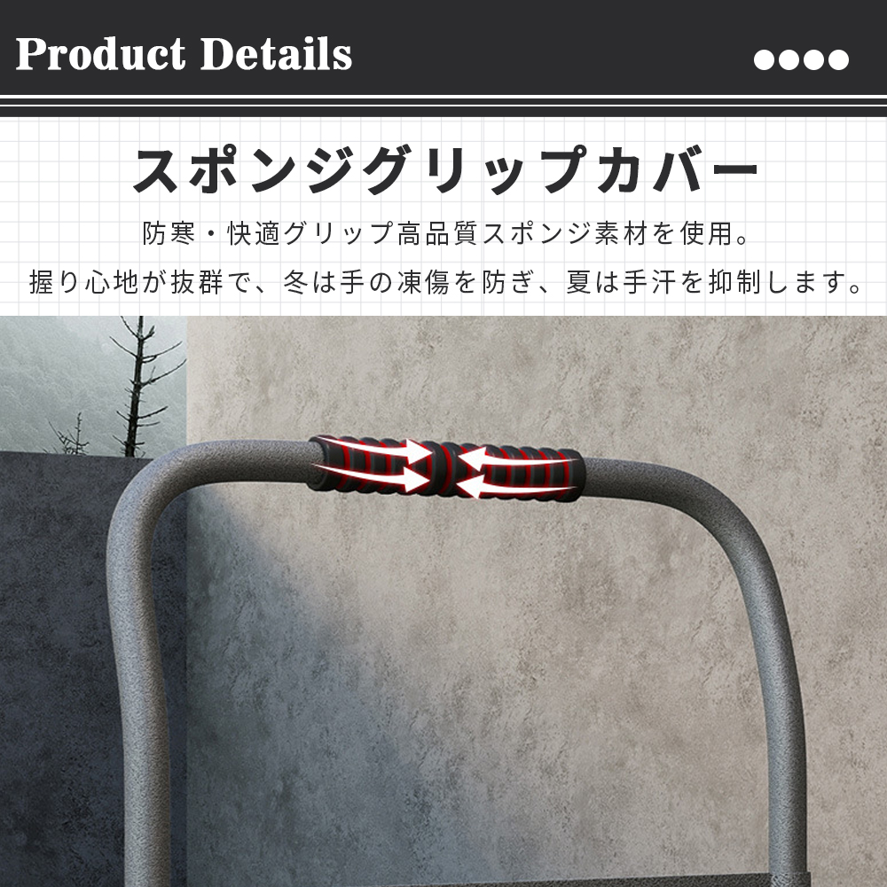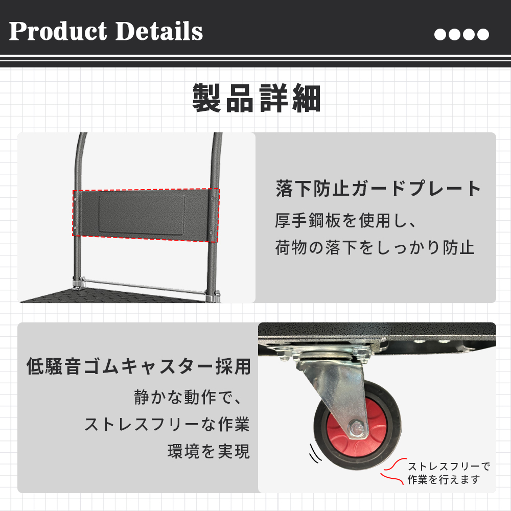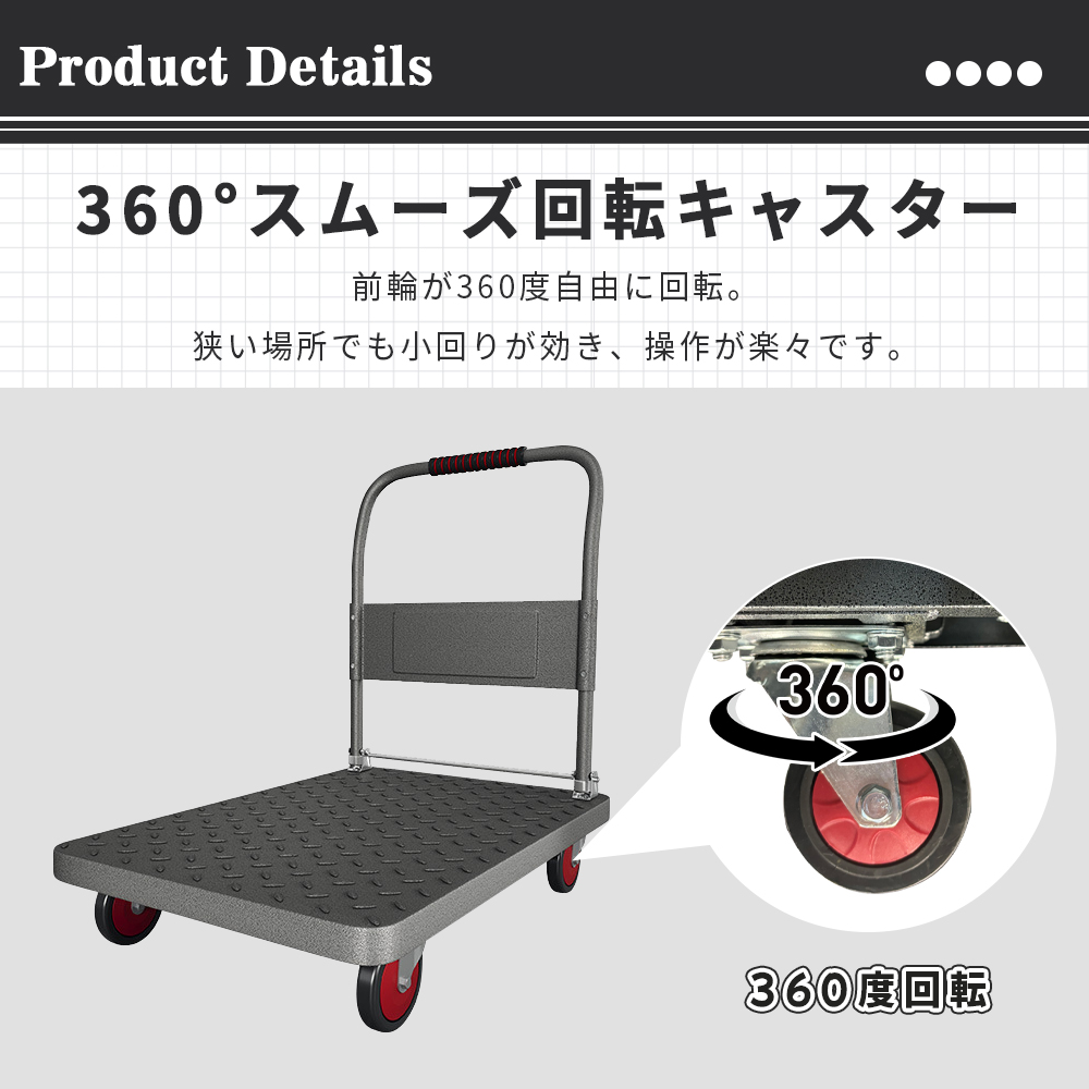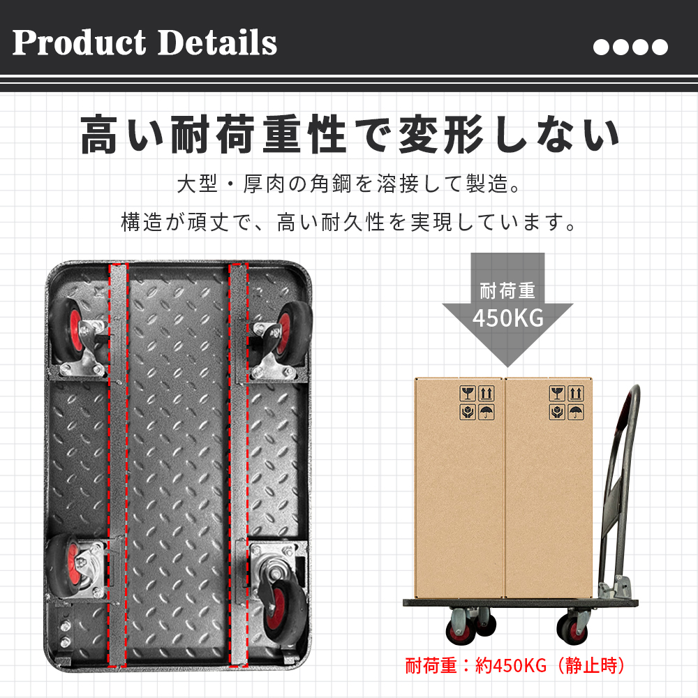 炭素鋼フレーム採用で最大450kgまで対応。家具・家電などの大型荷物も安定運搬。荷台表面の滑り止め加工で荷ずれを防止し安全性向上。