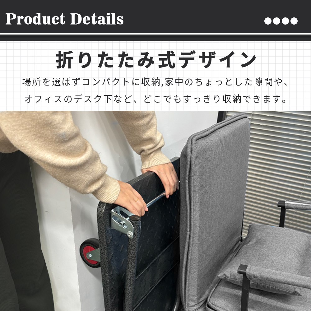 使用後はコンパクトに折りたたみ可能。厚さ約23cmの薄型で部屋の隅・車のトランクにすっきり収納。折りたたんだまま平台車としても使用可。