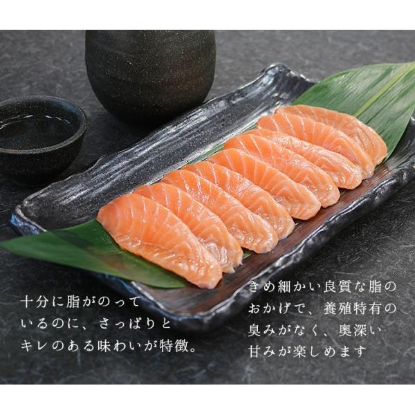 極寒の海ノルウェーでじっくり育ったサーモン。なめらかな舌触りと、口の中で優しくとろける脂が特徴。極寒の海の中でゆっくりじっくり育ったサーモンは脂が身に綺麗に入り、旨みも濃くなります。養殖特有の臭みがなく、奥深い甘みが楽しめます。漁獲後の生の状態でお刺身加工し急速冷凍。新鮮なおいしさを閉じ込め、より生に近い食感と味をお届けします。解凍後は切りつけの必要がなくそのままお刺身でお召し上がりいただけます。