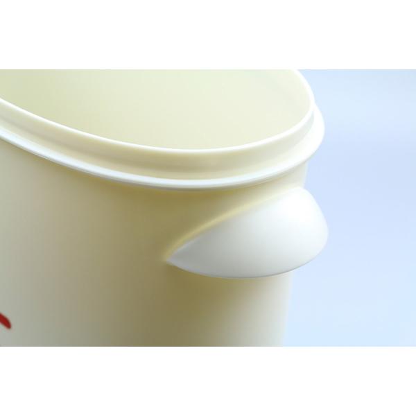 5kgのお米を袋のまま入れられるのでスッキリ収納、保存ができる。さらにお米の計量に便利な、無洗米も計れる計量カップ付。