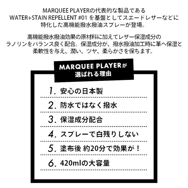 MARQUEE PLAYERの代表的な製品であるWATER+STAIN REPELLENT #01を基盤としてスエードレザーなどに特化した高機能撥水撥油スプレーが新開発されました!