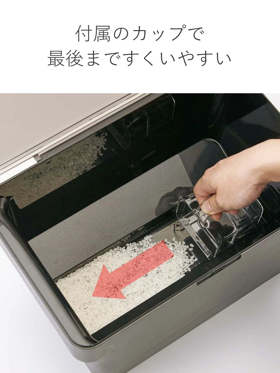 ●底の形が付属の計量カップとぴったり合うので、少なくなったお米も最後までキレイにすくうことができます。