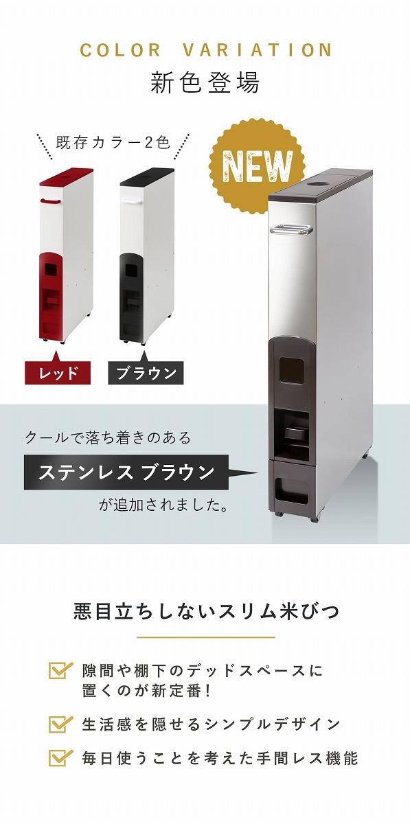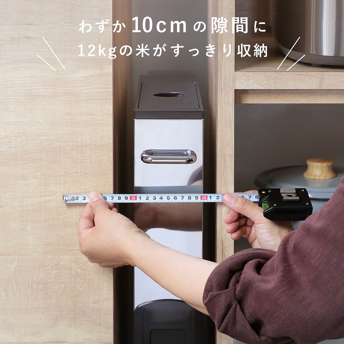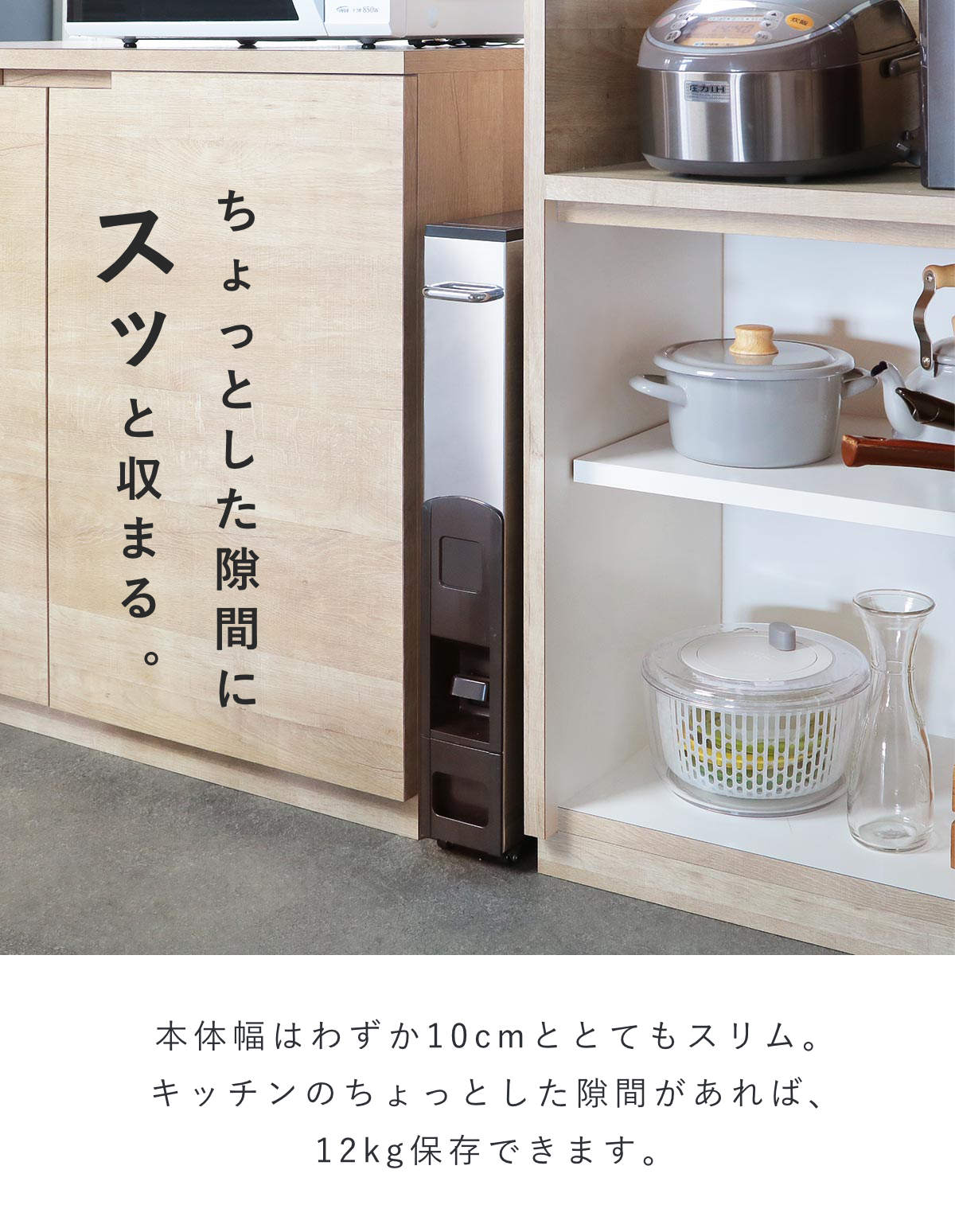 幅10cm ライスボックス 計量 10キロ用 1合計量 おしゃれ ライスディスペンサー 米櫃 スキマ 隙間 すきま 隙間収納 計量式 計量機能付き ワンプッシュ お米 収納 保存 保管 長期 ストッカー ストック 米 コメ こめ ライス 計量できる はかれる 計れる LH4476