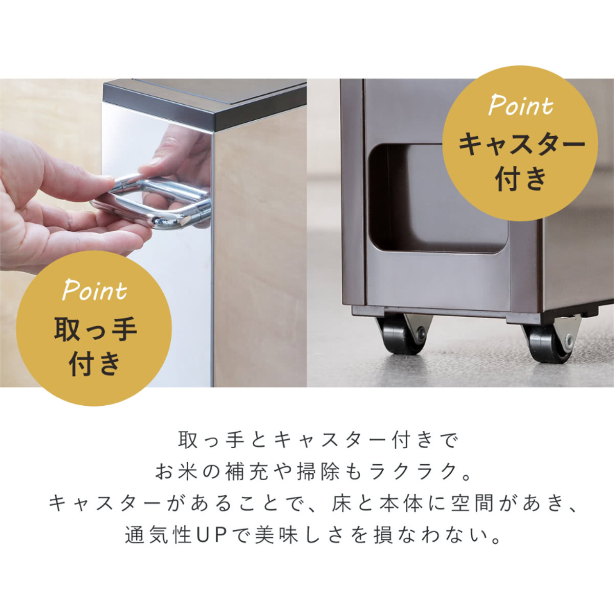●キャスターと取っ手付きなので、重たいお米が入っていても楽に動かすことができまます。