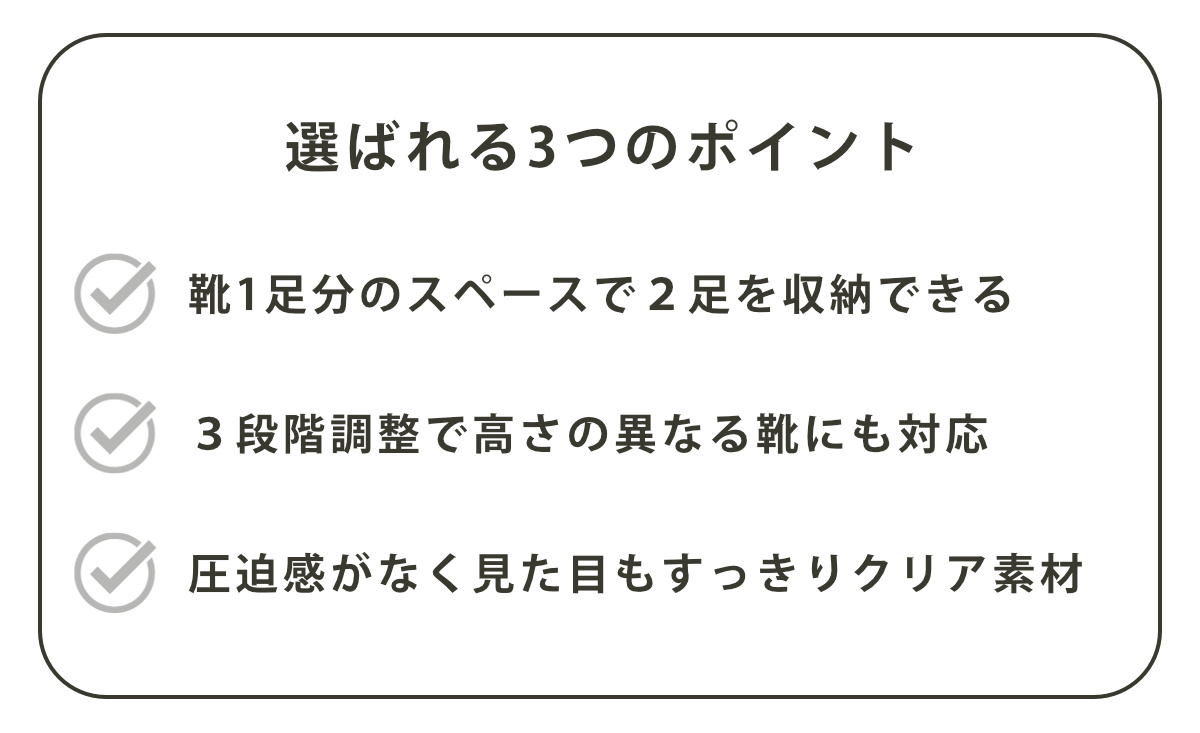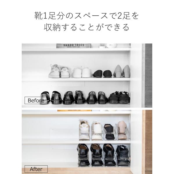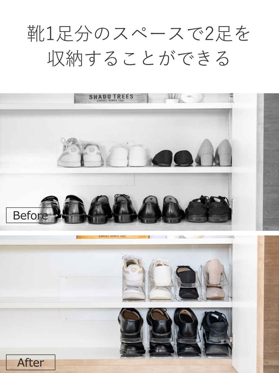 透明素材で見た目もスッキリ、靴2足を1足分のスペースに収納