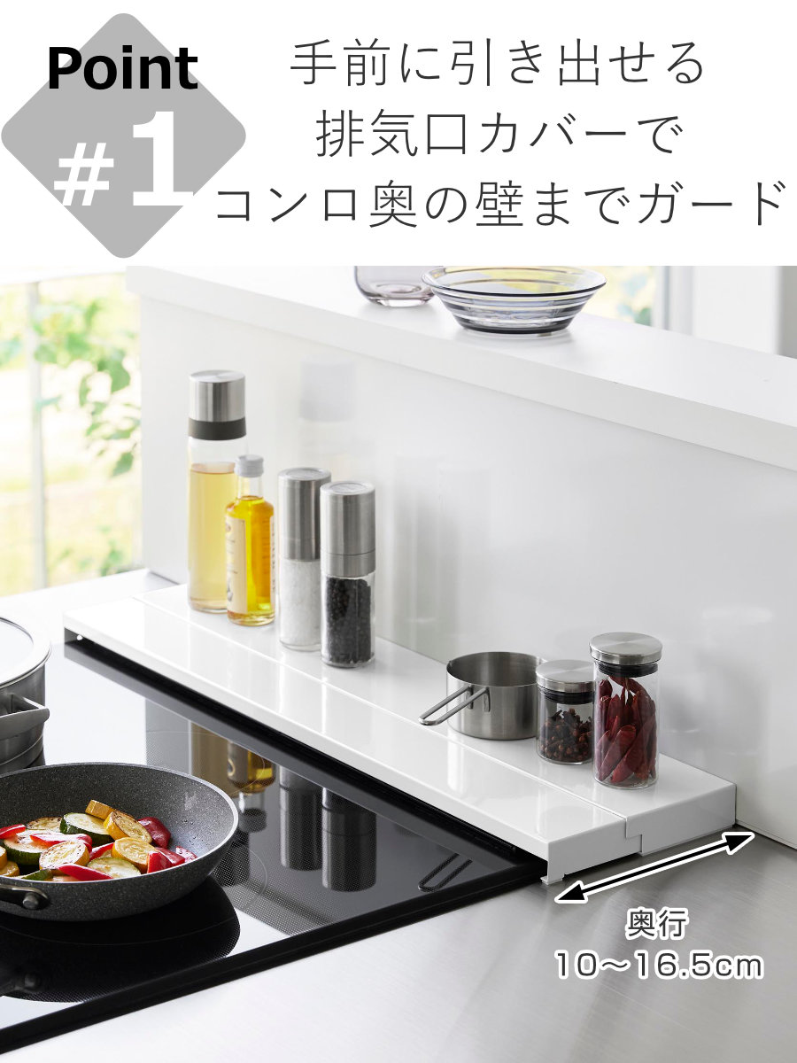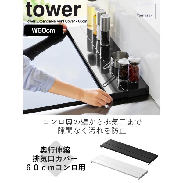 排気口用カバー 排気口ガード コンロ奥 伸縮 ホワイト ブラック 4903208045636 yamazaki towerシリーズ 山実 YAMAZAKI 山崎 やまじつ 白 黒 モノトーン 無地 ガード カバー コンロ奥カバー コンロガード コンロカバー 排気口 60cm グリルカバー 60 幅60 おすすめ オススメ 便利 シンプル スタイリッシュ お洒落 オシャレ おしゃれ キッチン用品 キッチン 収納 油はねガード コンロ 油ハネガード 油はね防止 油汚れ防止 汚れガード 調理汚れ防止 デッドスペース 有効活用 LH9813 LH11728 LH13814