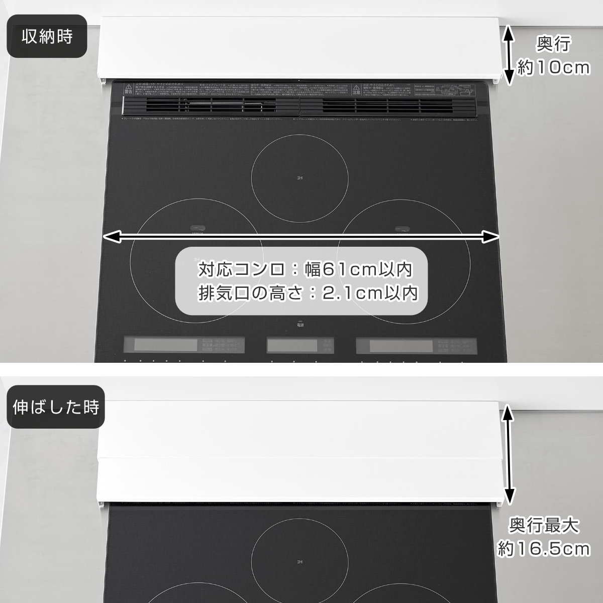 対応サイズ/対応サイズ:幅約61cm以内のビルトインガスコンロ・IHクッキングヒーター、高さ約2.1cm以内の排気口