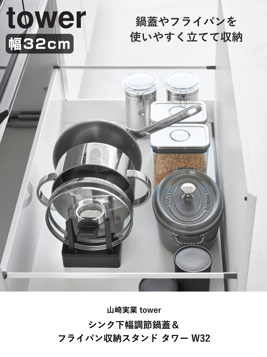 フライパンラック シンク下収納 鍋蓋立て 幅32cm 4903208013604 yamazaki towerシリーズ 山実 YAMAZAKI 山崎 やまじつ 白 黒 モノトーン 無地 スタイリッシュ シンプル ホワイト ブラック 幅調整可能 食器 お皿 皿 鍋フタ フライパン キッチン キッチン収納 シンク下収納ラック LH3813 LH17957