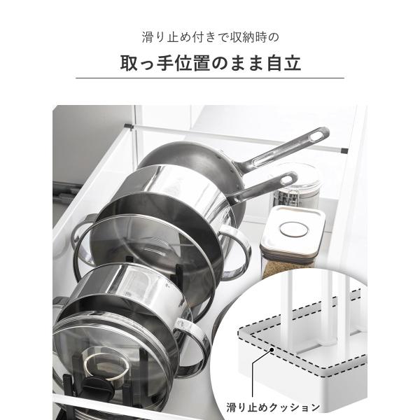 ●設置面にシリコーン製の滑り止めクッションが付いているので、フライパンなど収納時の取っ手位置のまま自立してくれます。