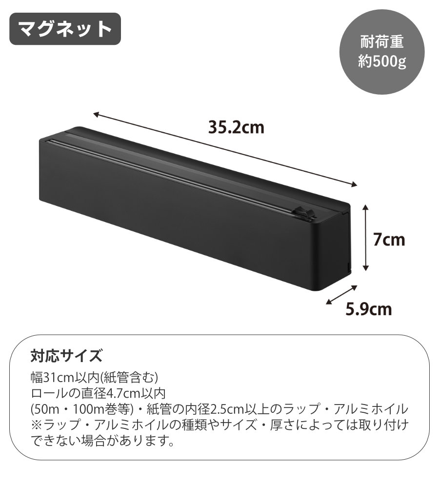 対応サイズ/幅31cm以内(紙管含む) ロールの直径4.7cm以内(50m・100m巻等)・紙管の内径2.5cm以上のラップ・アルミホイル