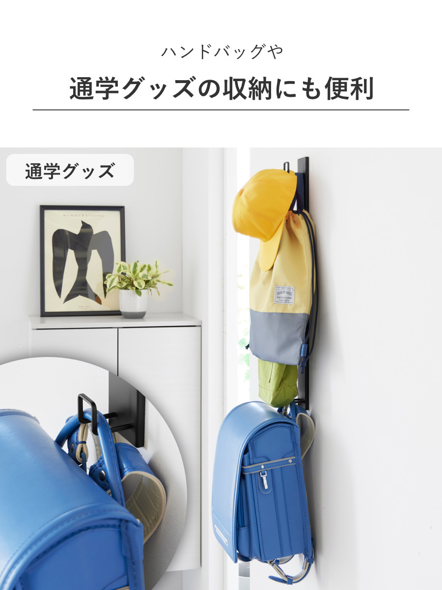 ●ハンドバッグや帽子、ランドセルの持ち手部分を引っ掛けて、通学グッズをまとめて収納するのもおすすめです。