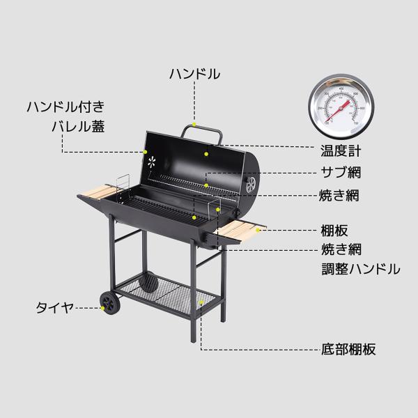 バレル式バーベキューコンロ 温度計で検温可能 ローストラック付き 焼き、燻製、蒸し3WAY 8-12人用 棚板 タイヤ追加 移動楽々 アウトドア キャンプ グランピング