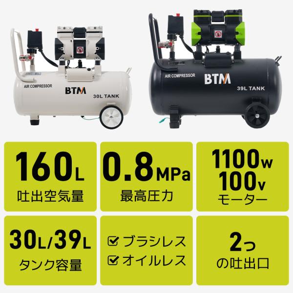 エアーコンプレッサー 2色 30L 39L エアコンプレッサー静音 ハイパワー 高速充填 オイルレス コンプレッサー 業務用 DIY 空気入れ エアコンプレッサー BTM