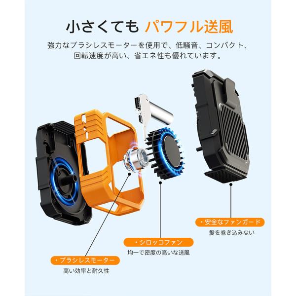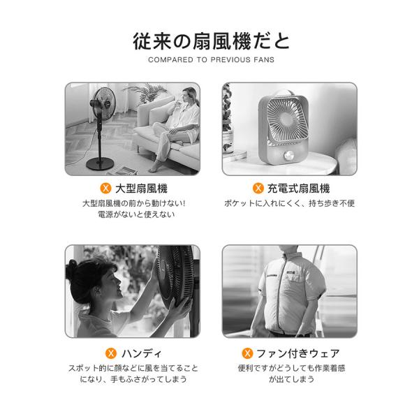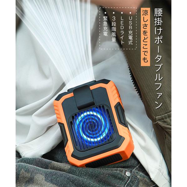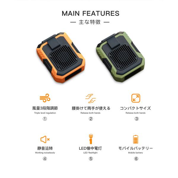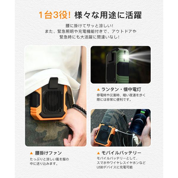 扇風機 ポータブル 腰掛けファン USB充電式 3段階風量 通勤 通学 作業 懐中電灯 モバイルバッテリー 緊急充電 ランタン ライト 防災用 耐久性 防水防塵 耐衝撃