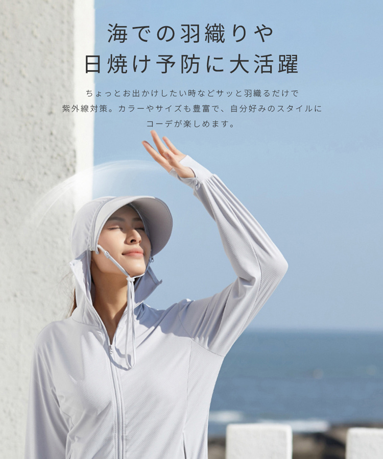 ツバ付きフードは、肌の露出を最小限に抑えて紫外線から肌や髪を守ります。フードをかぶれば首元や頭部の日焼け防止に役立ちます。