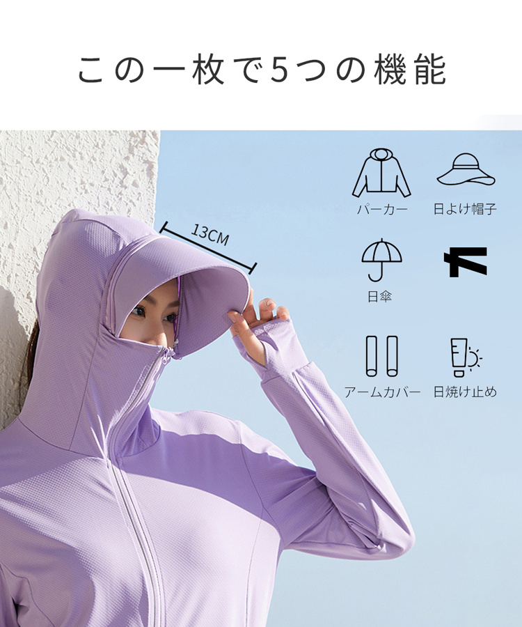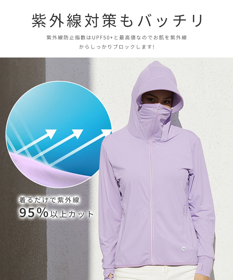 ジッパーを上まであげると、口元までしっかり覆うことができるので、顔をしっかりと紫外線からガード。