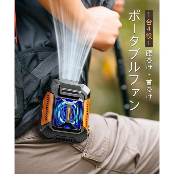 腰掛け扇風機 首掛け 携帯 ミニ扇風機 小型 腰掛けファン ポータブルファン USB充電式 3段階風量 LED懐中電灯 緊急充電 1台4役 耐衝撃 防水 防塵 防汗