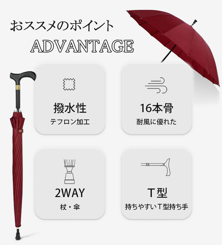 杖 ステッキ 傘 一体 16本骨 仕込み杖 つえ傘 晴雨兼用 男女兼用 軽量 滑り止め メンズ レディース 敬老の日 プレゼント