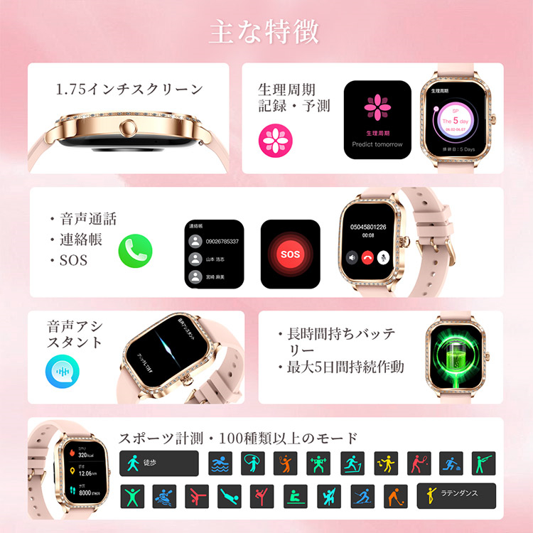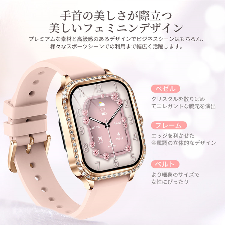 スマートウォッチ 通話可能 着信通知 スマートウォッチベルト シリコン ステンレスー PU iphone android 多機能 音声通話 LINE 対応 活動量計 生理周期記録・予測計 歩数計 IP68防水 USB式 腕時計 レディース向け スマートブレスレット 女性用 日本語説明書 音声通話 連絡帳 SOS機能 睡眠検測 アラーム 時計 正確 腕 誕生日 ギフト 女性の生理周期の注意 血中酸素計測 心拍数モニター 24時間継続的計測 睡眠モニター スポーツ計測 100種類以上のモード リストバンド スポーツ 送料無料 ランニングウォッチ gps測位 時計 腕時計 スマートウォッチ 非医療レベル 非軍用規格 日本製ではありません ベルト アラーム 着信通知 LINE 対応 活動量計 運動記録 大画面 リモート撮影 天気情報 健康管理 母の日 父の日 初心者 高齢者お中元 クリスマス バレンタイン 2026 2026