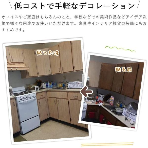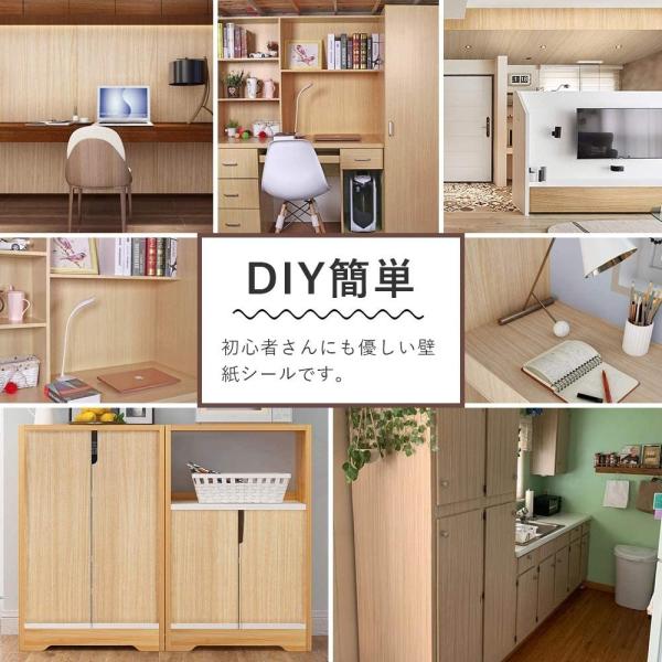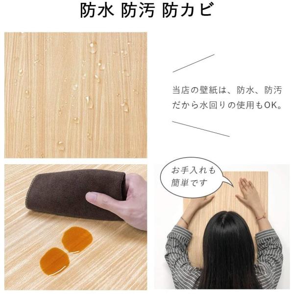 ・素材:壁紙シールはPVC(ポリ塩化ビニル)を採用し耐熱性と耐油性が良いです。表面は平らで木目方向に少しエンボス加工が施されていると同時に、滑らかさを維持しています。防水加工も施されており、家具や壁を湿気から守ることができます。汚れも付きにくく、お手入れはサッと水拭きするだけでOK。丈夫な素材で破れにくい壁紙シールです。
