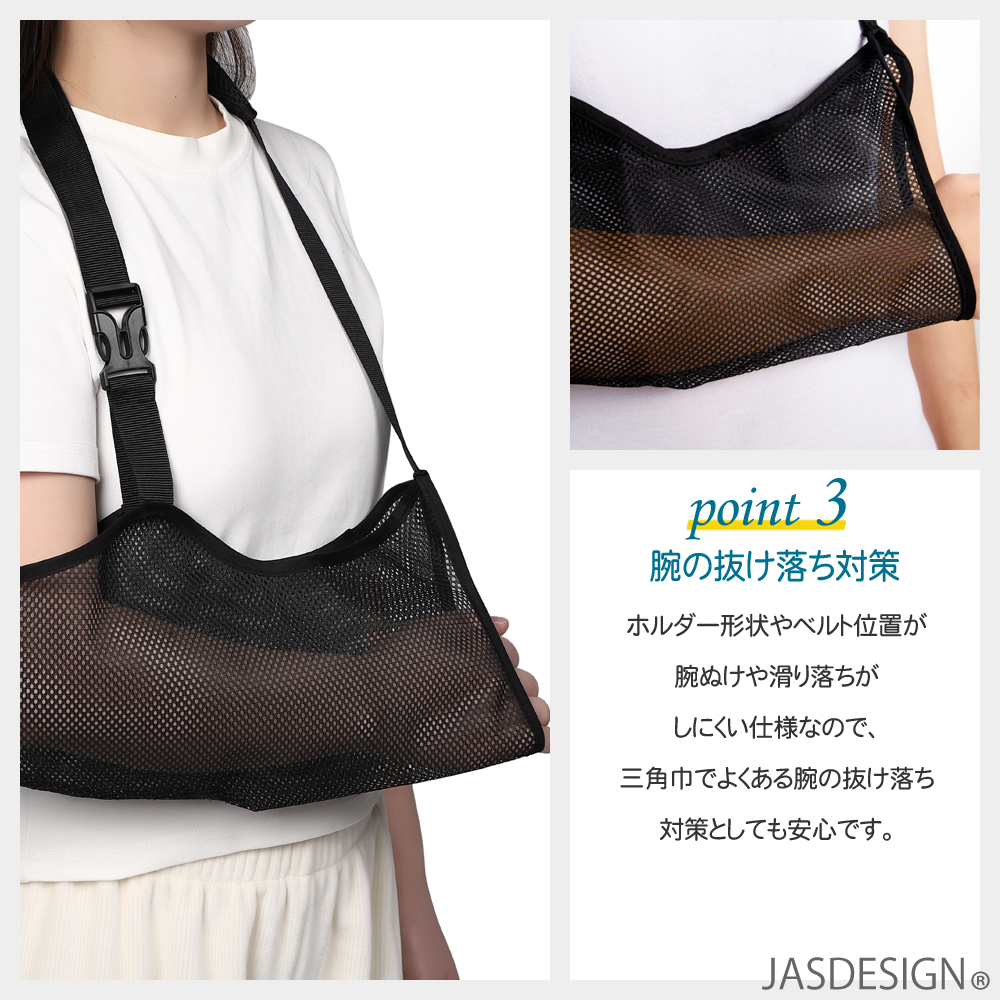 ホルダー形状やベルト位置が腕ぬけや滑り落ちがしにくい仕様なので、三角巾でよくある腕の抜け落ち対策としても安心です。