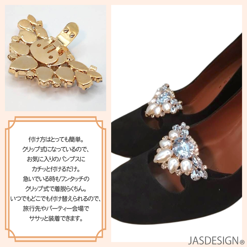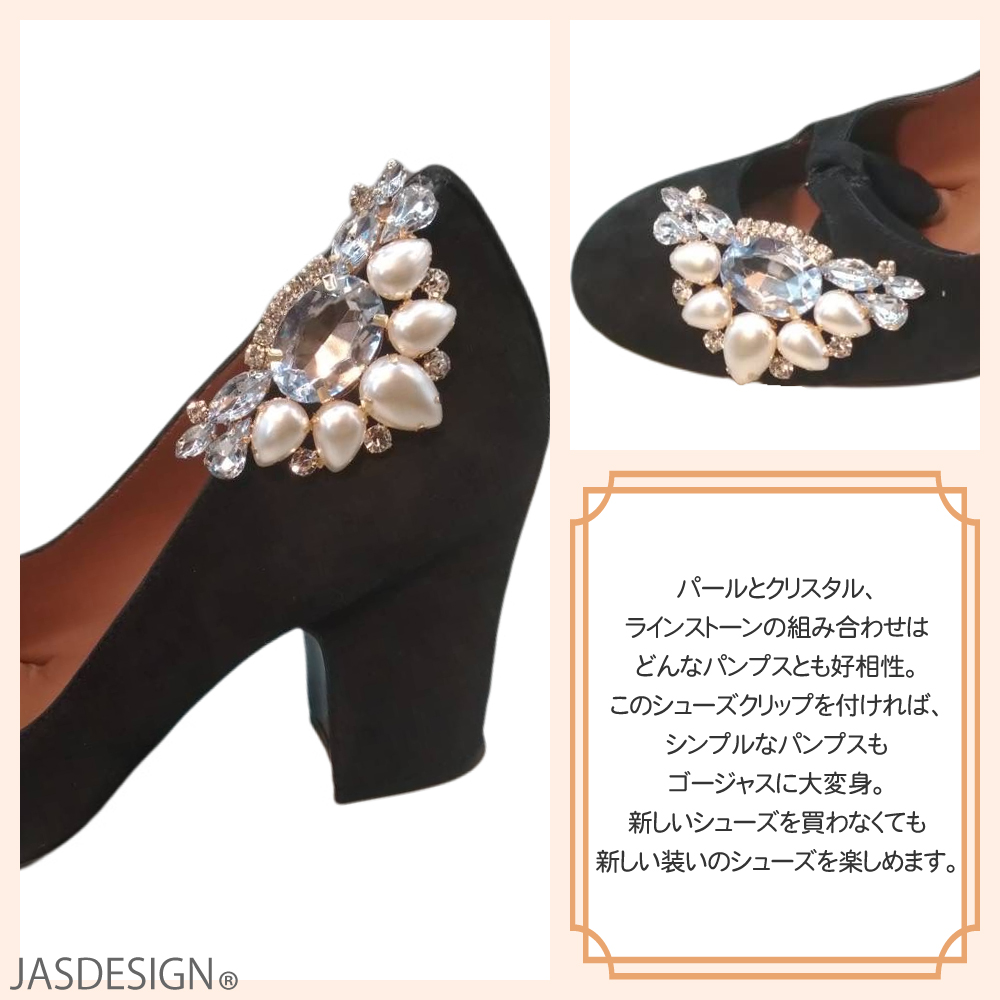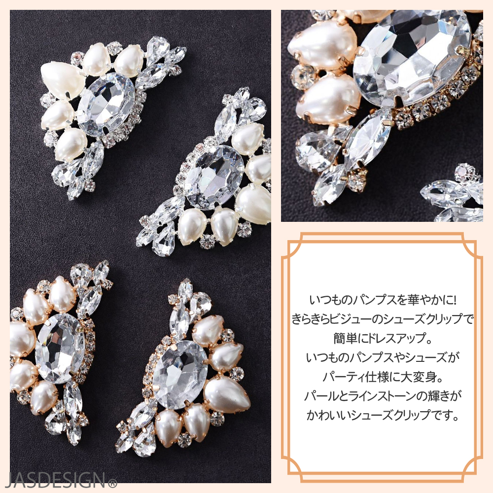 クリスタルビジュー シューズクリップ シューズチャーム 2個セット 靴 アクセサリー パール パーティー用 結婚式 ワンタッチ JM-249