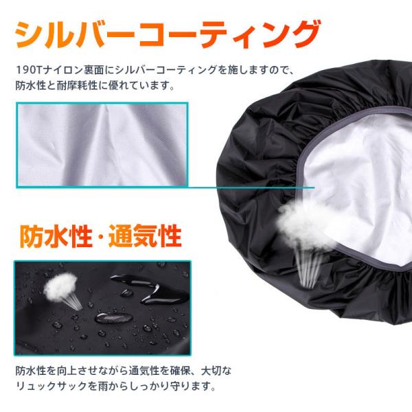 リュックサック用レインカバーです。レジャー、スポーツ、災害時、通勤、旅行など色々なシーンで使用することができます!190Tナイロン裏面にシルバーコーティングを施しますので、防水性と耐摩耗性に優れています。防水性を向上させながら通気性を確保、大切なリュックサックを雨からしっかり守ります。伸縮性のあるゴムを使用し、簡単にリュックに被せることができます。