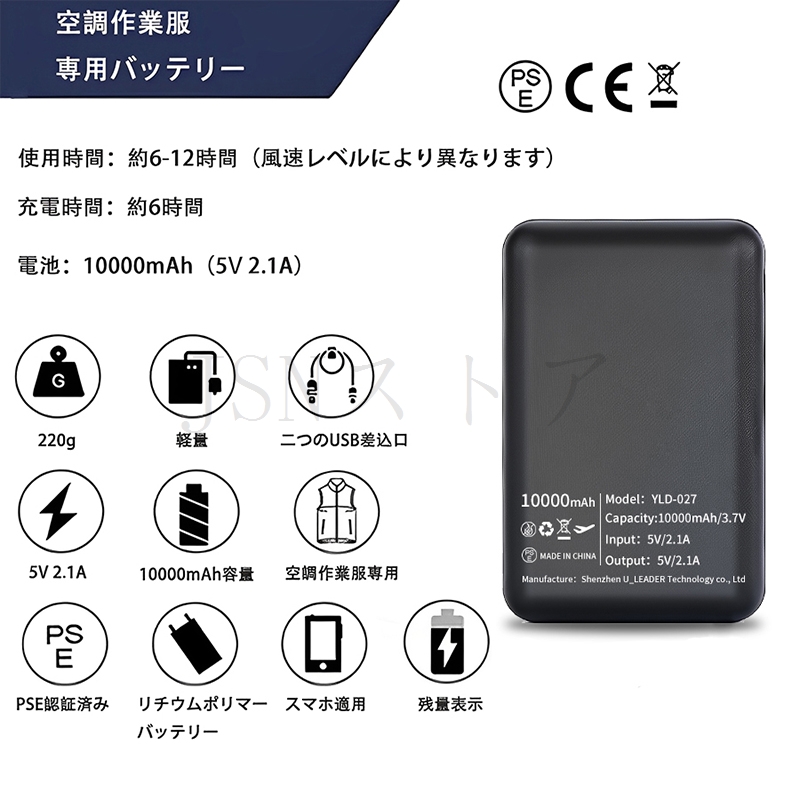 【バッテリー】10000mAh:弱(約12h)、中(約9h)、強(約6h)