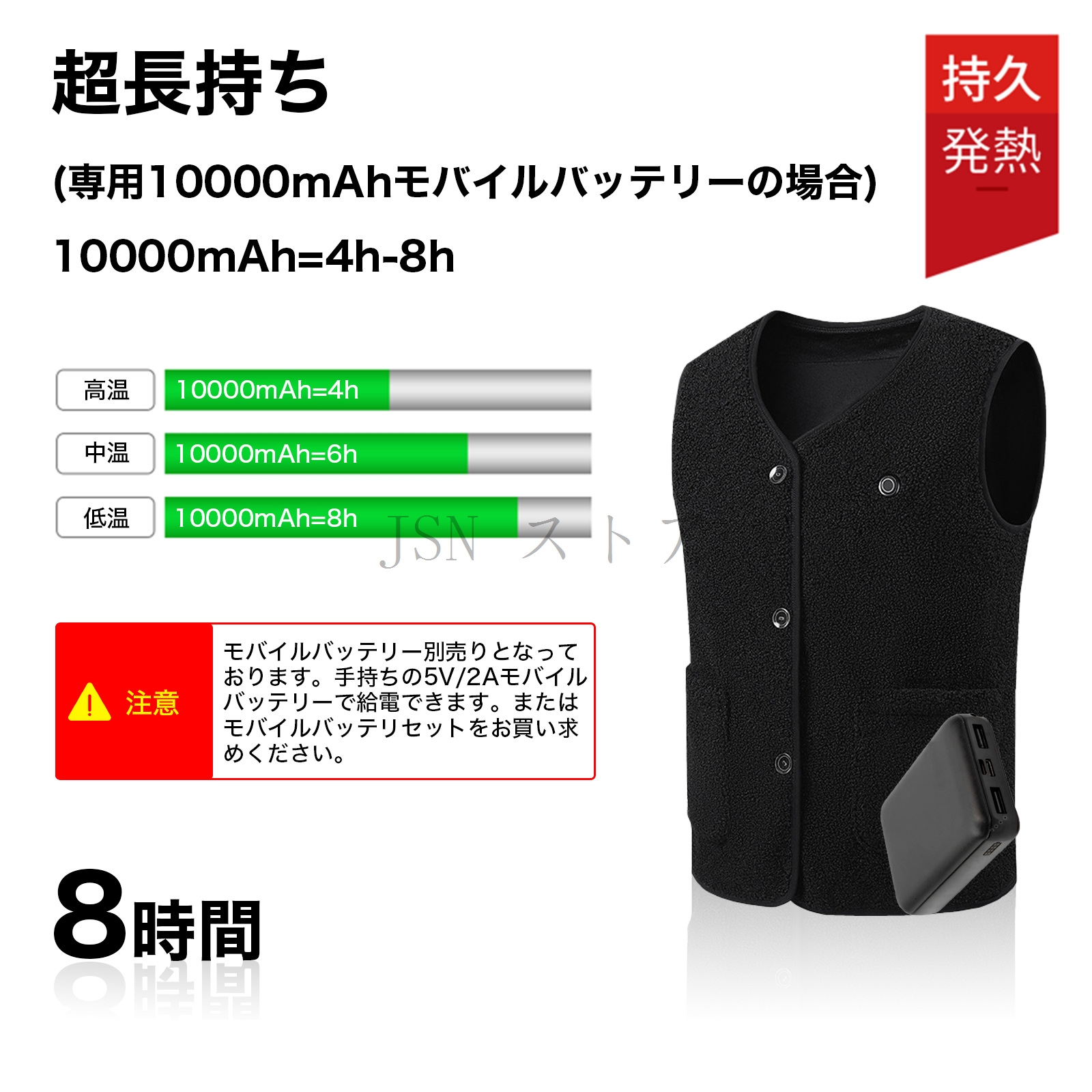 【バッテリー】10000mAh:低温(約8h)、 中温(約6h)、 高温(約4h)